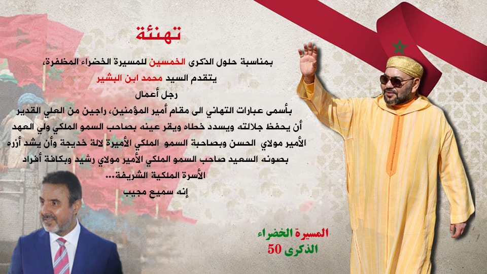 الرئيسية/تهنئة المسيرة الخضراء 2025/السيد “محمد ابن البشير” يهنئ جلالة الملك بمناسبة الذكرى الخمسين للمسيرة الخضراء المظفرة السيد “محمد ابن البشير” يهنئ جلالة الملك بمناسبة الذكرى الخمسين للمسيرة الخضراء المظفرة ميدنيوز نوفمبر 6, 2025 4٬298 نوفمبر 6, 2025 4٬298 شاركها فيسبوك X ماسنجر ماسنجر واتساب تيلقرام طباعة